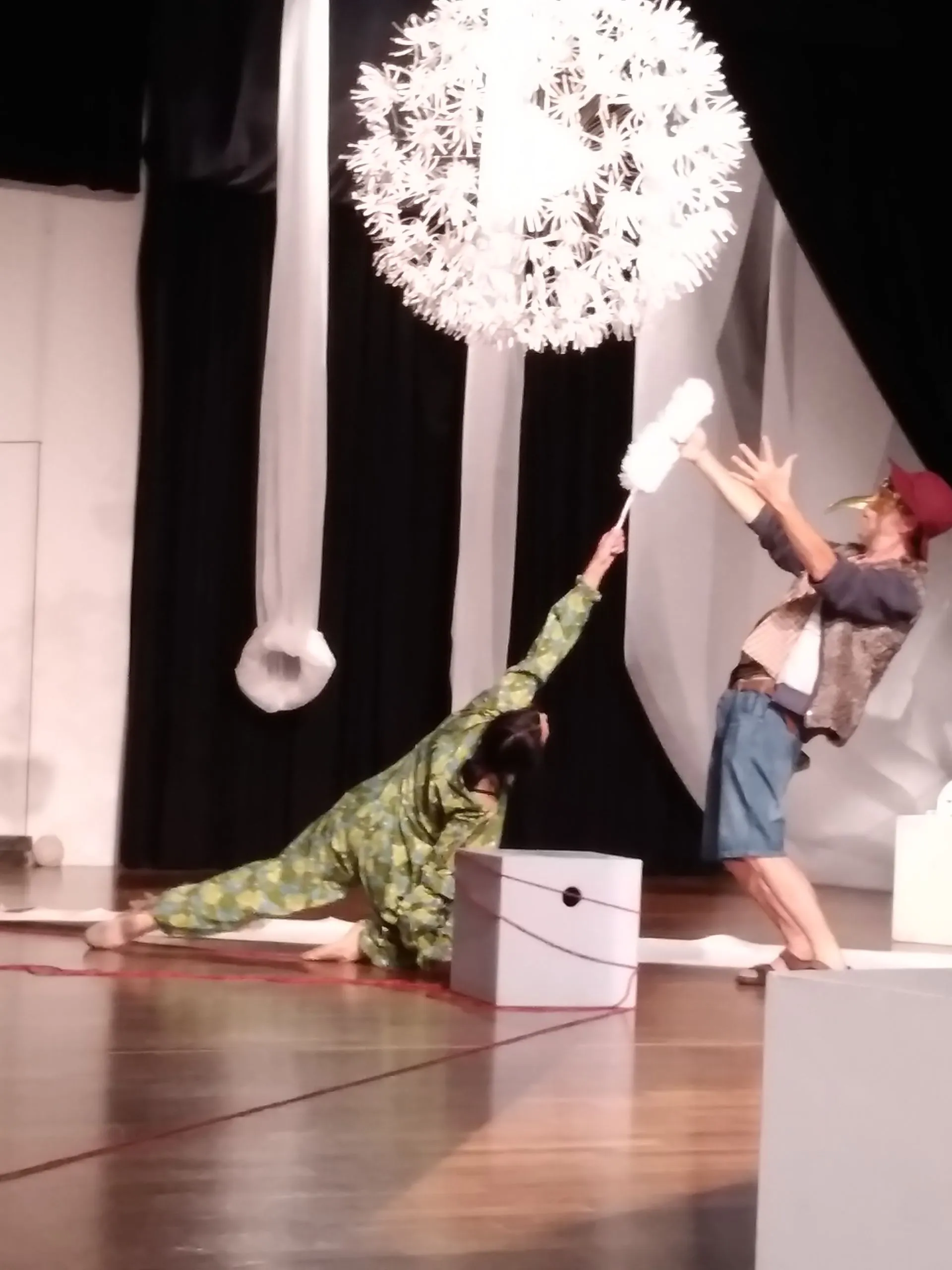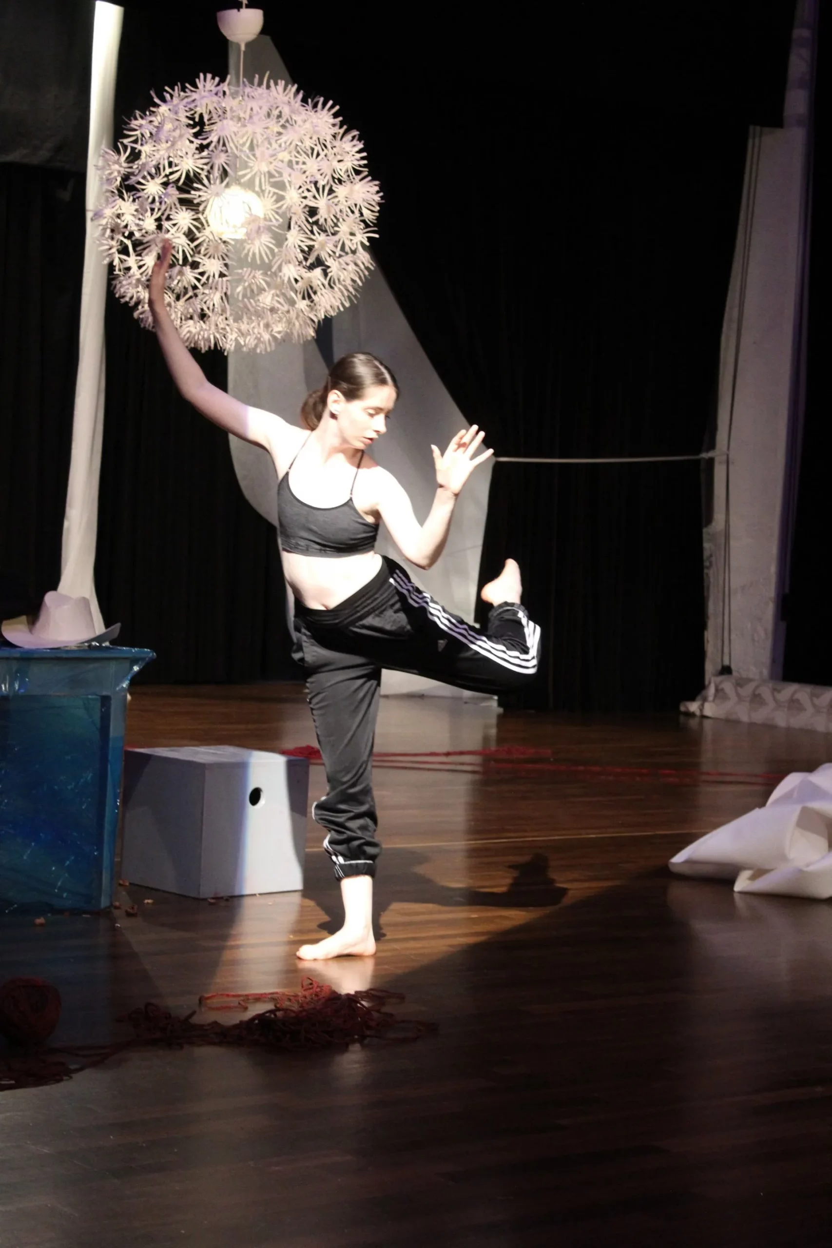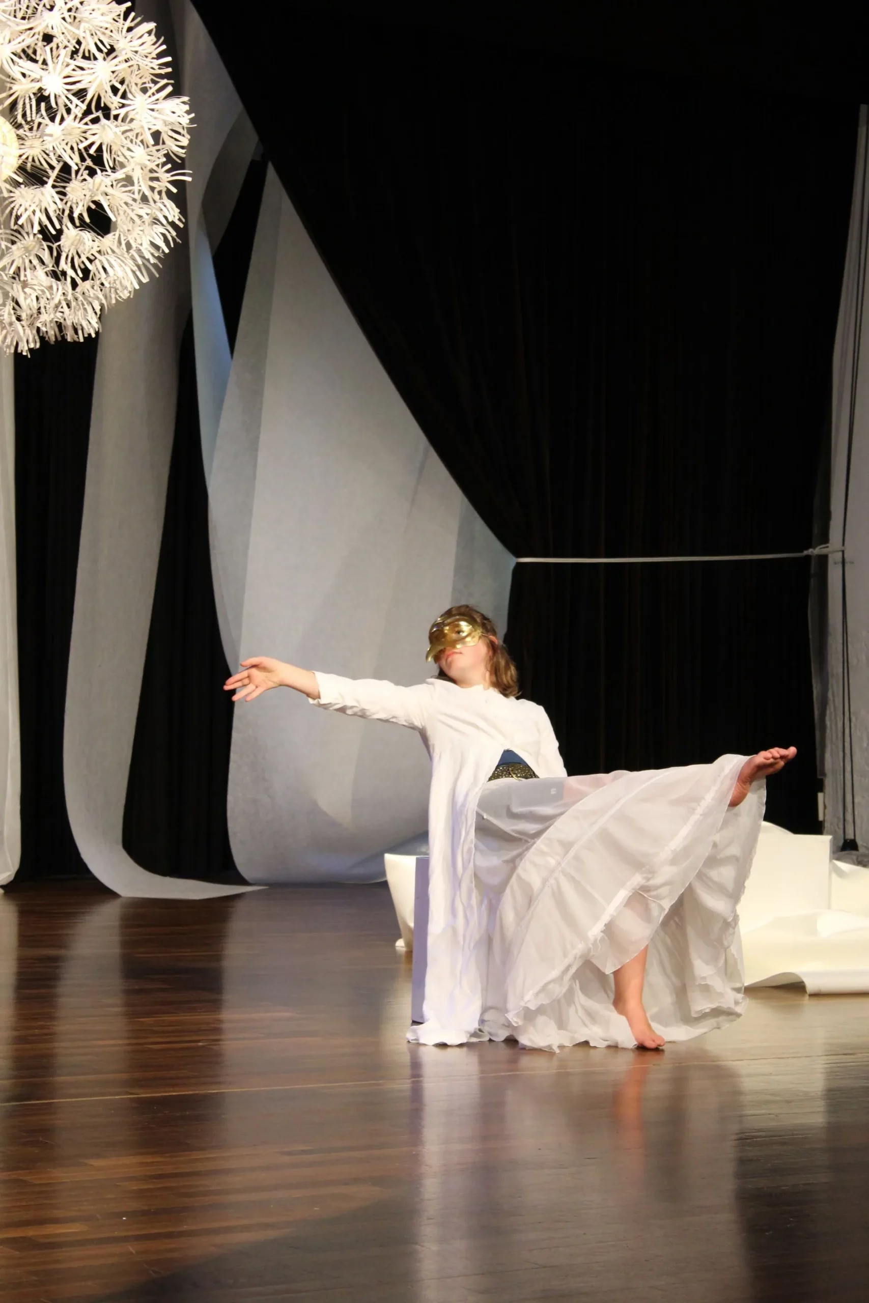 Du darfst aus dem Schatten treten ins Licht, ganz gegenwartsbezogen und spontan improvisieren mit dem, was der Moment bietet. Kreiere eine Figur, suche eine Geste, starte eine Handlung, reagiere auf die Klänge, interagiere mit den anderen. Im Grunde ist die Installation eine Art „Theaterparkour“ in der du die Freuden und Leiden einer Live-Performance in vollen Zügen erleben kannst. Du kannst effizient und kraftsparend arbeiten, oder in barocken Verzierungen, Umwegen und Sackgassen deine Zeit auf der Bühne ausgestalten und genießen wie es dir gefällt.